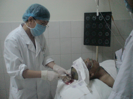 ( 图为神内二科毕向峰主任及助手在为患者实施该手术)