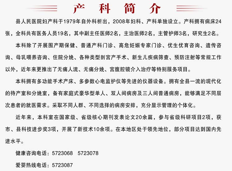 [科室名称] 妇产科一区 [科室成员] 李小荣等 [联系电话] 5723068 5723078 [科室介绍]