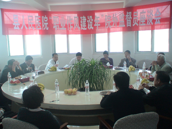 5月10日下午,我院在三楼圆厅会议室召开“职业作风建设年” 院外监督员座谈会,来自我县社会各界的16位人士共聚一堂,各抒己见,为我院的职业作风建设把脉会诊,建言献策。会上,院长高春香对09年以来各项工作做了简要汇报,虚心向各界人士征求意见和建议,发放了问卷调查表。监督员们踊跃发言,共提出改善服务态度、加强人才培养等合理化建议26条。