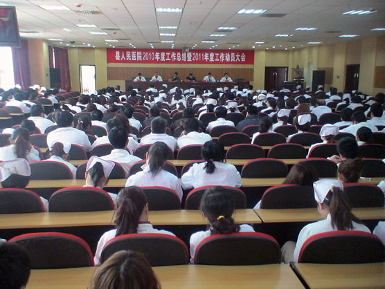 2011年3月4日,风和日暖,人心振奋,迁西县人民医院2010年工作总结暨2011年工作动员会在15楼会议室隆重召开。县政府副县长李进有,卫生局党委书记谢玉峰应邀出席了会议并作重要讲话。院长高春香、党委书记王悦东、副院长时明龙、田士松出席了会议,院内450余名职工参加了会议。会议由院党委书记王悦东主持,院长高春香总结了2010年工作,并就2011年工作进行强调和部署。