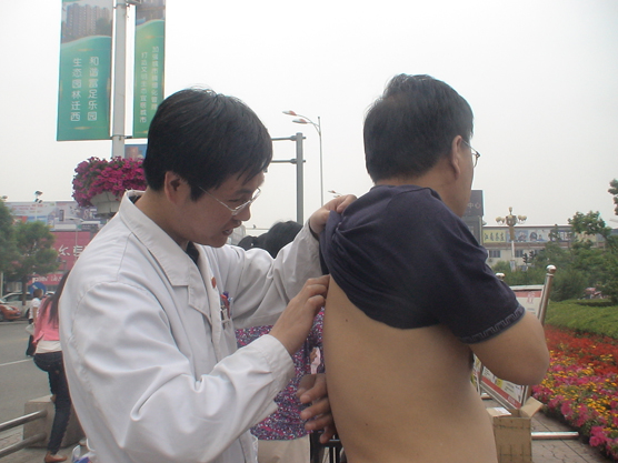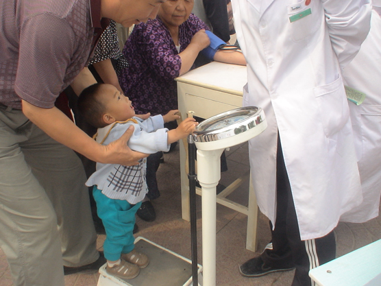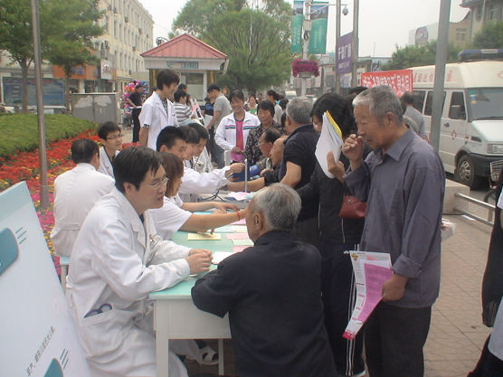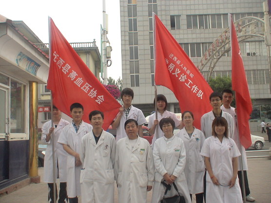 义诊现场,我院党员义诊工作队旗帜和迁西县高血压协会、迁西县糖尿病协会旗帜迎风飘扬,高血压和糖尿病宣传知识展板引来群众驻足观看,志愿者们更是以饱满的工作热情全身心的投入到次活动中,为群众提供优质、便捷的医疗服务,有的为群众做检查、有的耐心地解答群众提出的医疗保健方面的问题、有的测血压、有的帮助群众称体重,有的发放高血压、糖尿病、手足口病等健康知识宣传单.....。尤其专家马长治和业务骨干郭全付、刘瑞超更是忙个不停,不时有群众向他们提出相关疾病咨询,他们都一一为群众耐心、热情解答,还为群众现场力检查,作出治疗指导。随着中午临近,群众逐渐散去,经过3个小时的紧张忙碌,义诊活动圆满结束,全体义诊人员在义诊现场合影留念。