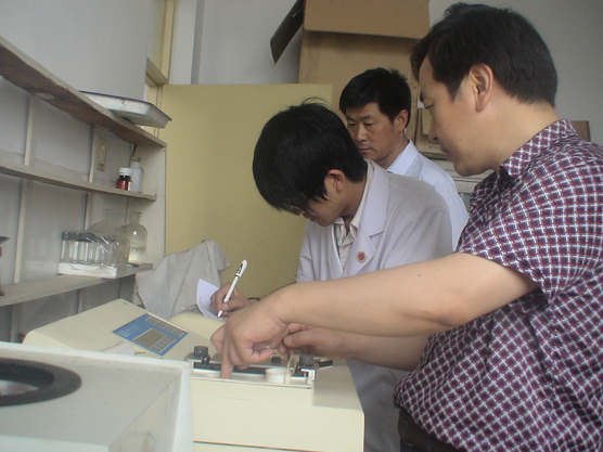 (我院检验科主任王万清、器械科主任刘国清正在指导太平寨检验科人员使用血凝仪)