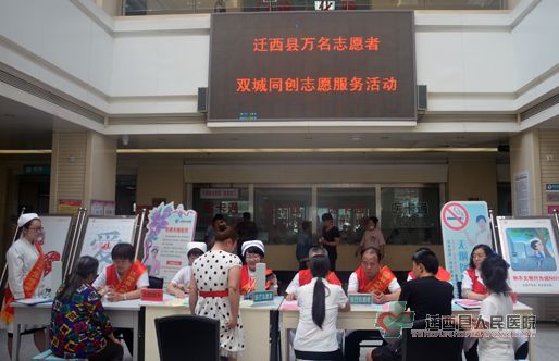 2017年5月20日上午,按照县创城指挥部安排,我院由内、外、儿科、中医科资深专家及护理人员组成医疗志愿服务队,在板栗博物馆广场参加全县万名志愿者双城同创志愿活动后,回到医院门诊大厅,继续开展了一场双城同创医疗志愿服务活动,免费为来院患者及家属测血压、量身高体重、诊查身体、发放健康处方,同时呼吁广大来院患者及家属“人人奉献爱心,携手文明共建,共建美好家园”。 据统计,本次活动共免费诊查患者200余人次,发放健康处方500余张,发放创建全国文明县城卫生县城宣传单近500张,进一步提高了群众“双城同创”知晓率及创城热情。