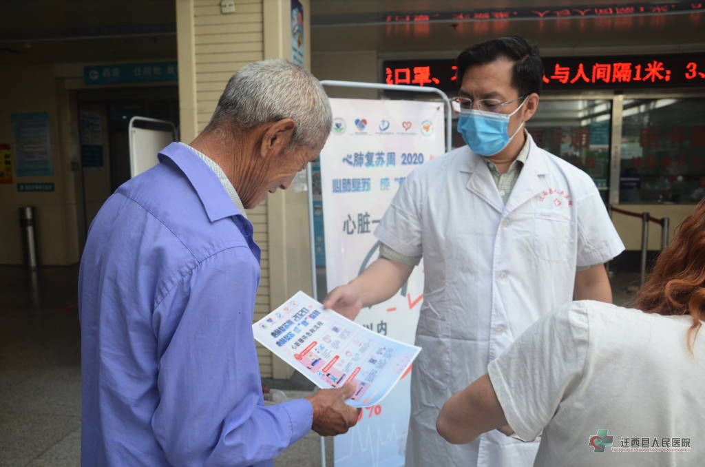 在医院门诊大厅,志愿者们向来院群众发放印有心脏骤停急救流程的宣传彩页,现场示范心肺复苏流程。