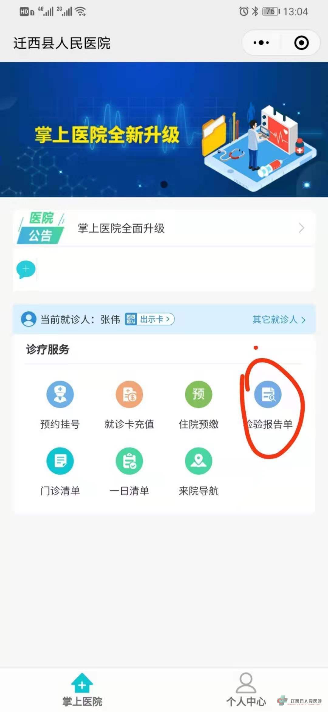患者在就医的过程中会有各种检验和检查项目,为了方便患者,我院配备了检验、检查等自助打印设备,为患者带来了很多便捷服务。但由于每名患者情况不同,有一部分检验、检查项目的报告需要下午或第二天才能出具,这种情况下患者在院等待的话时间偏长,不等的话还得再跑一趟医院。为有效缓解这一现状,进一步方便患者,院领导积极作为,组织信息科升级改造了公众号的报告查询功能使用系统。现在患者只需关注“迁西县人民医院”微信公众号-检验报告单,就可用手机查看检验、检查报告啦! 患者关注医院微信公众号后,根据要求绑定个人信息,系统自动会为您建立专属档案,检验报告可在手机端查看,也方便异地就医时随时查看,报告查询覆盖门诊和住院。 【操作流程】 第一步: 关注“迁西县人民医院”微信公众号。 第二步: 如果是第一次使用,需要绑定就诊卡并实名认证,可以绑定自己的就诊卡,也可绑定家人的就诊卡,方便查询。 第三步: 绑定后点击【掌上医院】,【检验报告单】即可查询报告单信息。