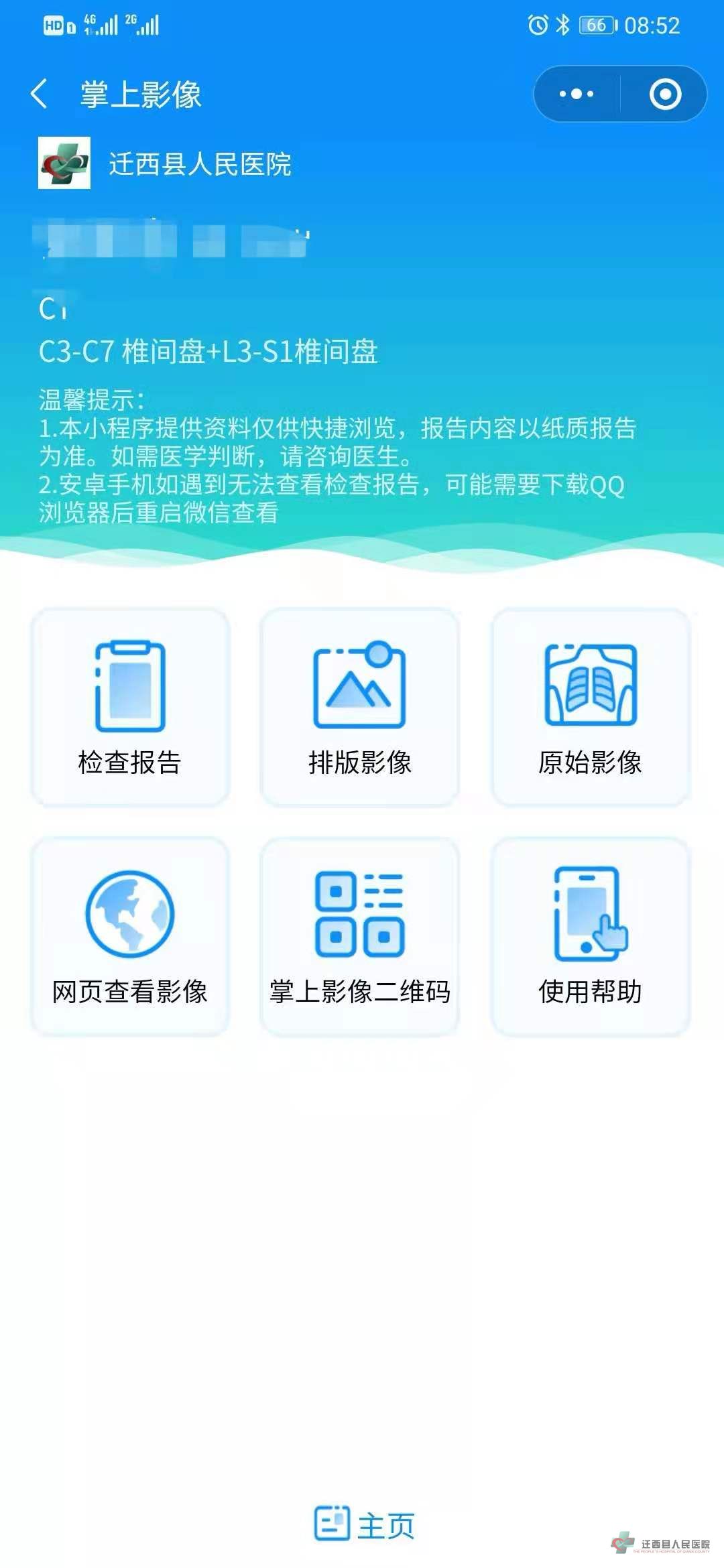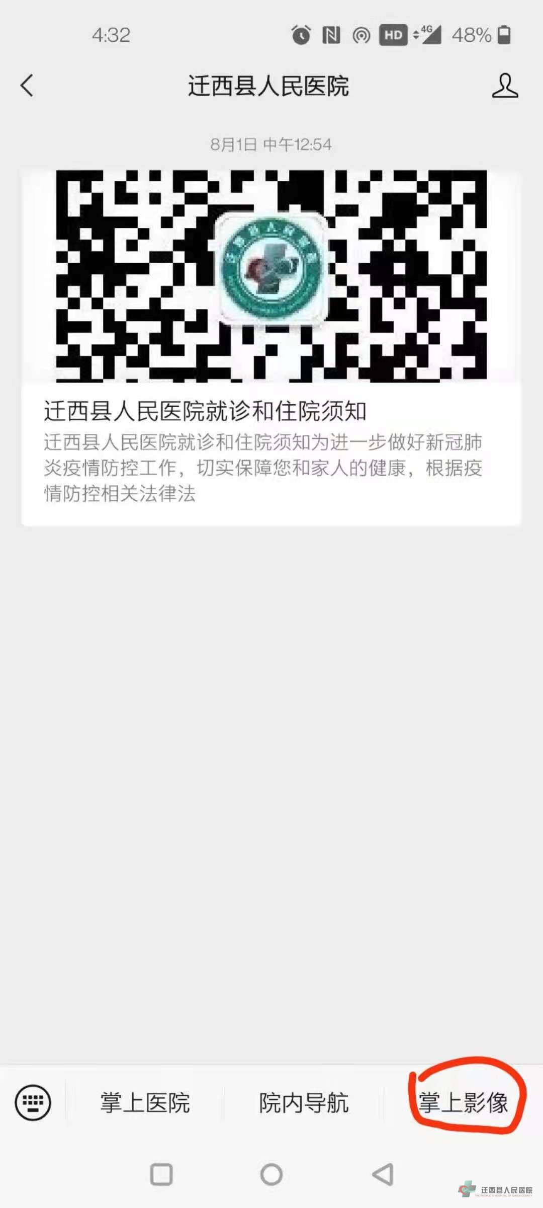 同时,为方便患者,迁西县人民医院公众号把【迁西掌上影像】即迁西县人民医院云胶片系统集成到了一起,患者关注公众号后,打开右下角【掌上影像】,即可打开云胶片小程序,绑定患者信息以后即可查阅患者的CT、MR报告及影像。“云胶片”是指储存在云空间的电子数字医学影像及电子报告,患者可以通过电脑、手机、平板电脑等智能终端设备查看和分享影像检查资料。
