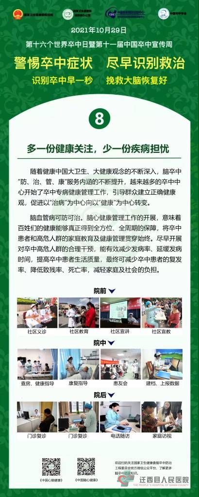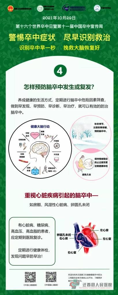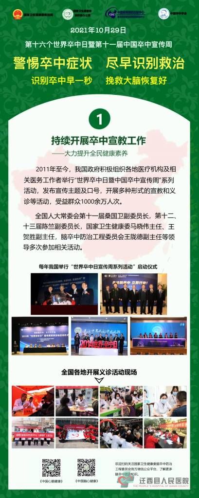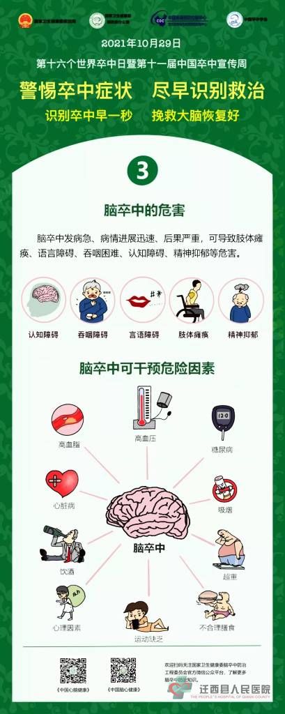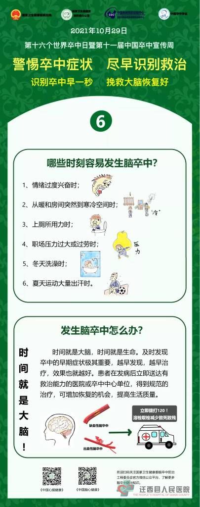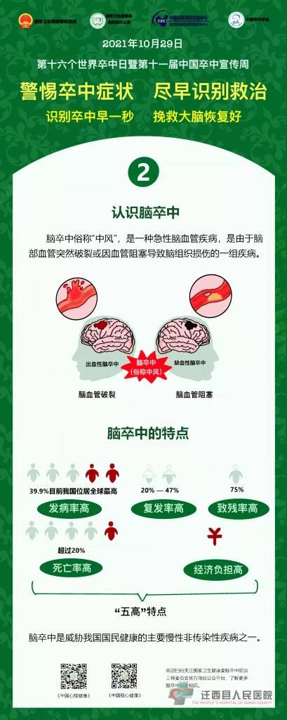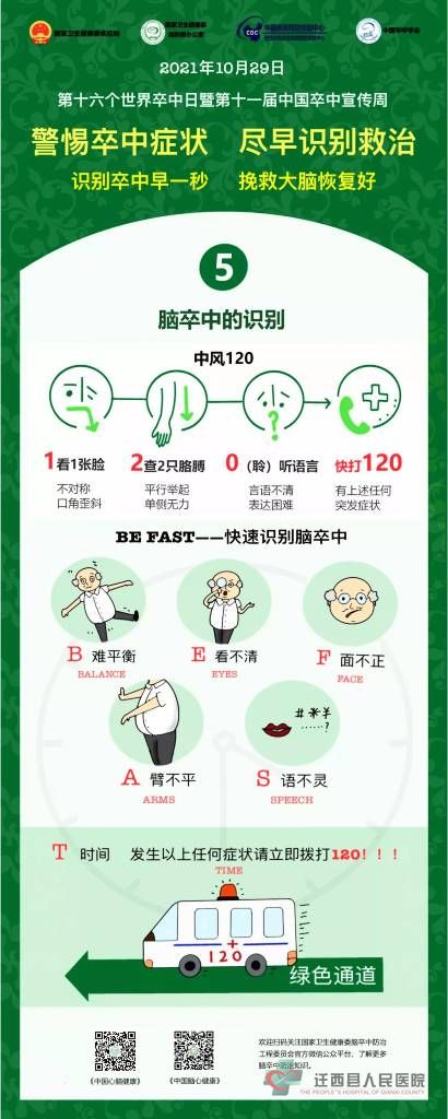 2021年10月29日是第16个“世界卒中日”,宣传主题是“警惕卒中症状,尽早识别救治”,宣传口号是“识别卒中早一秒,挽救大脑恢复好”。