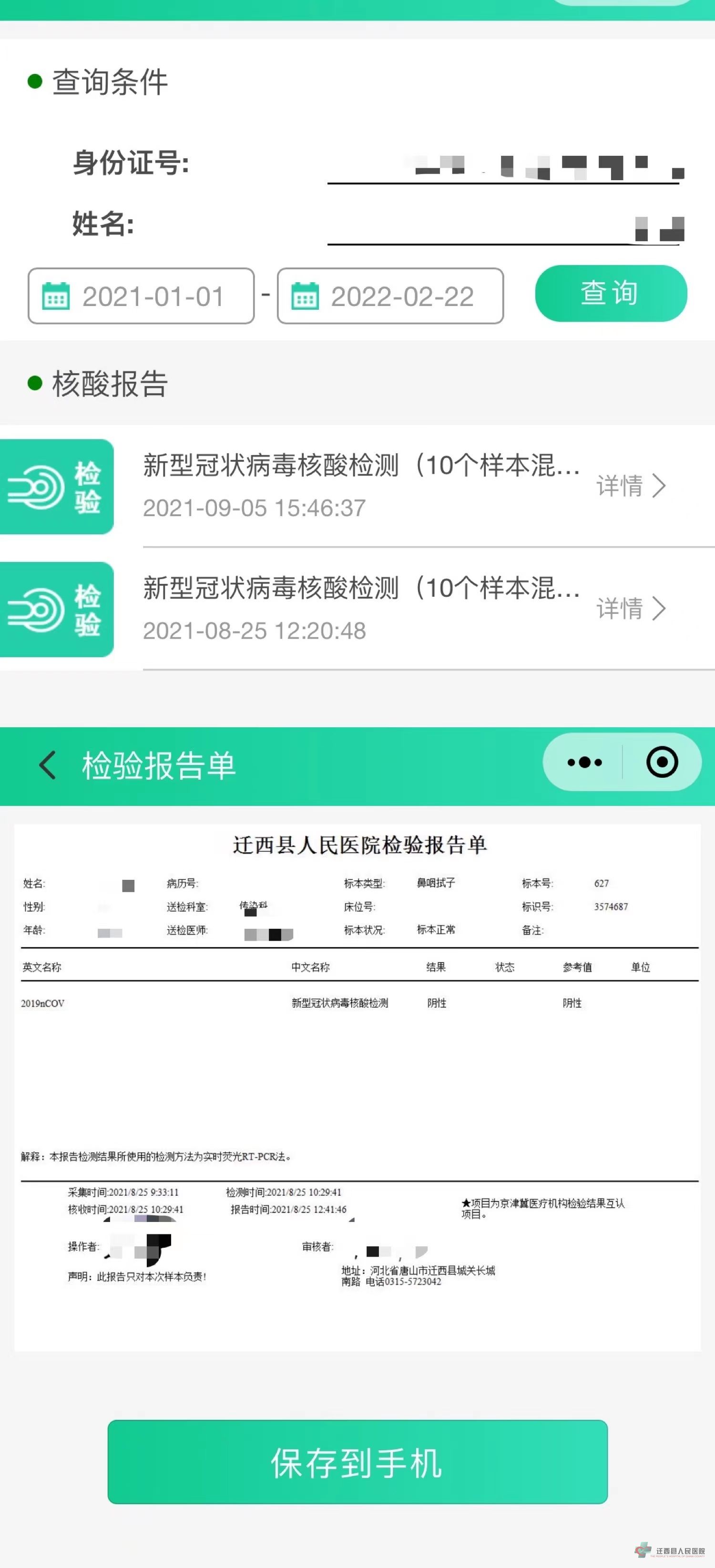 核酸检测是诊断“新冠肺炎”的重要手段,为满足社会人群对核酸检测的需求,特通知如下: 【检测时间】 每周一到周日上午8:00-11:30、下午13:30-17:30集中采集。 【检测流程】 持本人身份证到核酸检测标本采集处登记信息、扫码缴费、进行采集样本(发热人员除外)。 【收费标准】 单采40元,混采8元。 【出结果时间】 每天上午10:00前采集下午14:00后出结果; 每天下午15:30前采集晚上19:00后出结果。 【核酸检测报告打印地点】 核酸采集点北自助打印机或门诊大厅二楼自助打印机。 【电子报告查询方法】 微信小程序中搜索“迁西人民医院”。检验报告单查询输入姓名、身份证号即可查询结果,电子报告与纸质版报告出具时间一致。