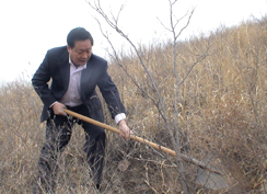 2009年3月29日,县人民医院近百名职工参加了全县绿化攻坚活动。图为院长高春香正在带头劳动。