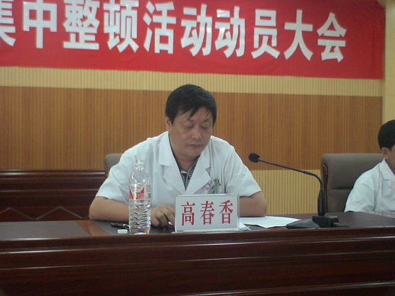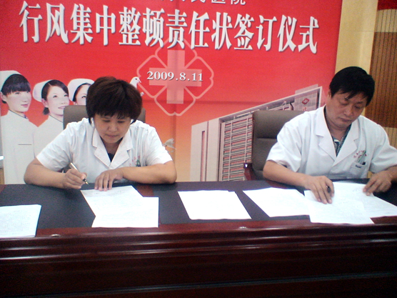 第二由院长代表院班子与院内科室负责人分别签订了责任状。院长高春香做了重要讲话,他指出:“今天,我们召开了行业作风集中整顿活动动员大会,旨在动员全院广大干部职工对行业作风工作认清形势,提高认识,增强信心,全员参与,更好地履行职责,做好服务。”并提出了四点意见:一是提高认识,每名医务工作者要充分认识在院内集中开展行业作风整顿活动的重要性及紧迫性;二、战胜自我,每个科室和个人要搞好自查自纠,敢于“揭丑”,实事求是的人人写出自查材料,边整边改提高水平;三是强化责任,院科两级领导要结合自己工作分工,把握环节,盯准细节,确保活动有序进行;四是落实奖惩,对存在问题较多或在活动中顶风违纪的要追究责任,严肃处理。最后,他强调,全院职工要增强服务意识,提高服务质量,促进医院发展,努力把人民医院办成百姓放心满意的人民医院。