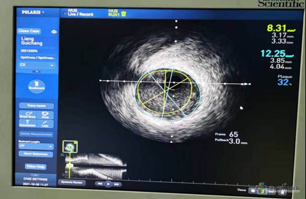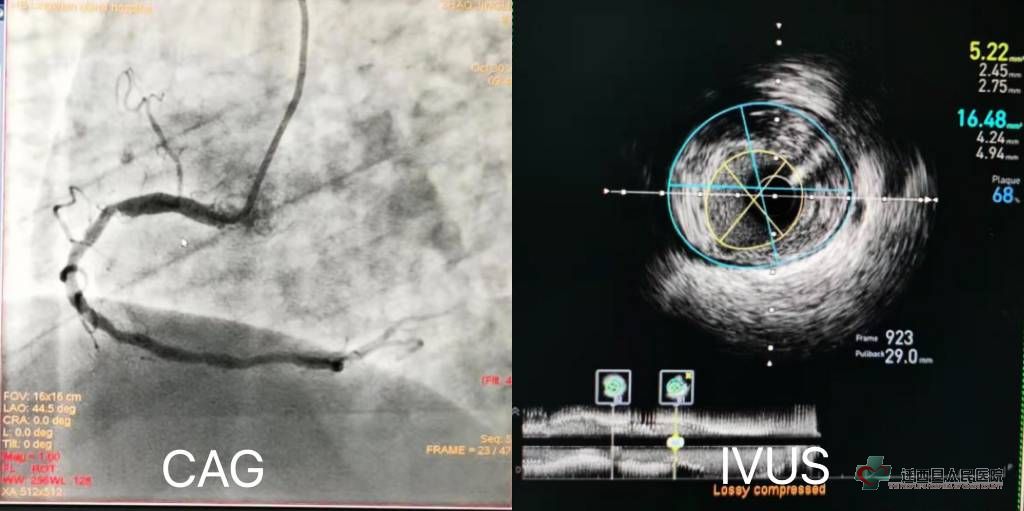 术中经IVUS证实,患者右冠可见动脉粥样硬化斑块及脂质斑块,血管最重的斑块负荷达管腔面积68%,暂不需进行介入治疗。 病例2:患者男性,也是69岁,间断心悸、气短2年,加重伴呼吸困难2天,以“冠心病、心力衰竭”收入院,经规范的治疗心功能明显改善,住院期间患者反复发生卧位型心绞痛。