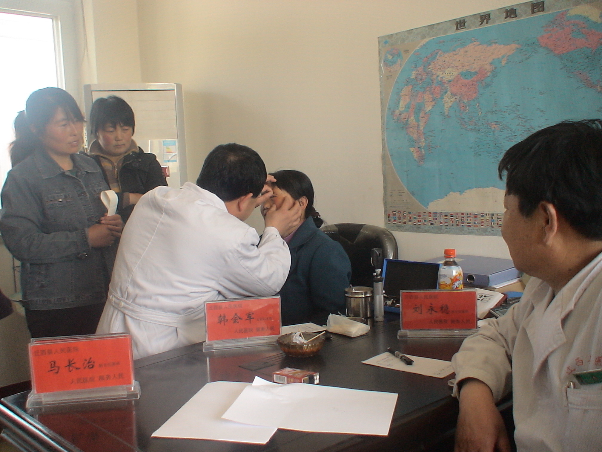 (在黑石峪村五官科主任韩会军正在为村民做眼部检查)