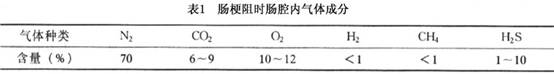 Hibbard 1976年报道狗的试验性肠梗阻其肠腔内的气体成分如表1