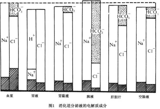 肠管中的液体一部分来自摄入的水分 但大部分是积存的消化液 正常人的消化道在24h内分泌8~10L的消化液 除100~200ml被排出人体外 大部分都回吸收到血液中 维持体液的动态平衡 肠道中消化液的电解质成分与血浆中的电解质成分相似(图1) 因此肠液的丢失就等于血浆的丢失